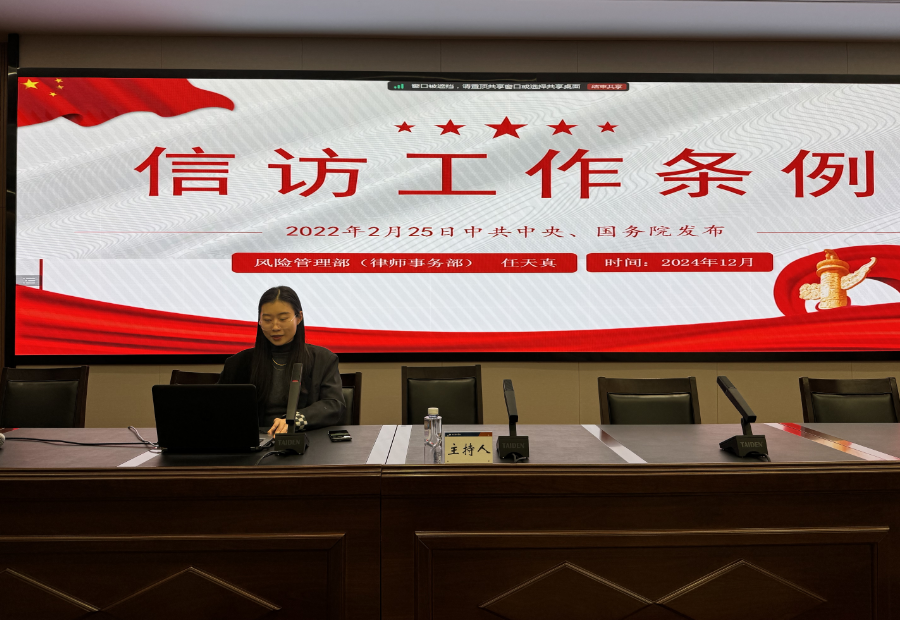 風險管理部(律師事務部)任天真同志,對《條例》出臺背景、意義、特點、主要內容等進行了深入介紹,并通過正、反案例展開生動剖析,提升了集團全員對信訪工作的認識和理解。