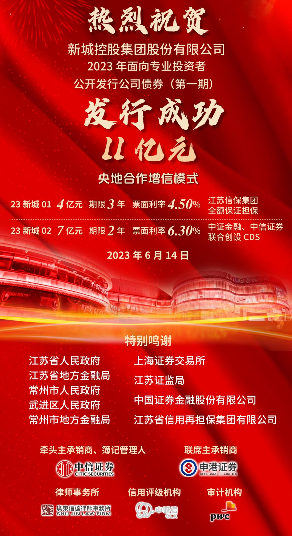 據(jù)悉,當(dāng)日發(fā)行吸引了眾多金融機構(gòu)踴躍參與投標。該期債券規(guī)模共計11億元,分兩個品種發(fā)行。其中,債券“23新城01”發(fā)行規(guī)模4億元,期限3年,由江蘇省信用再擔(dān)保集團有限公司全額擔(dān)保,發(fā)行票面利率為4.50%。債券“23新城02”發(fā)行規(guī)模7億元,期限2年,由中國證券金融股份有限公司聯(lián)合中信證券創(chuàng)設(shè)信用緩釋工具,發(fā)行票面利率為6.30%。