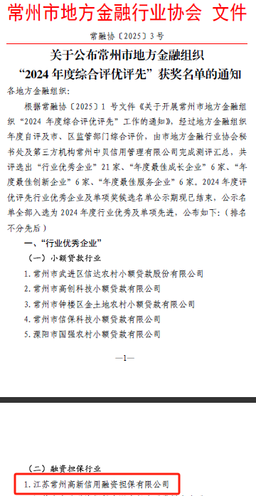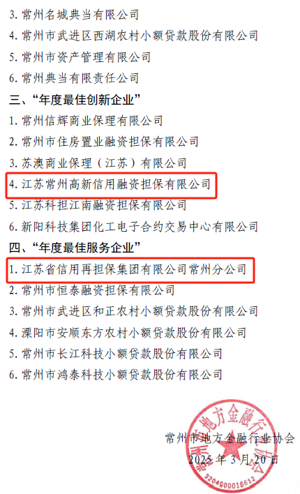 3月20日,常州市地方金融行業(yè)協(xié)會(huì)發(fā)布了“2024年度綜合評(píng)優(yōu)評(píng)先”獲獎(jiǎng)名單,常州一體化區(qū)域兩家機(jī)構(gòu)再度獲評(píng)。迄今為止,常州分公司已經(jīng)連續(xù)2年獲評(píng)“年度最佳服務(wù)企業(yè)”,常州高新?lián)9具B續(xù)4年成為“行業(yè)優(yōu)秀企業(yè)”,并接連2年獲評(píng)“最佳創(chuàng)新企業(yè)”。