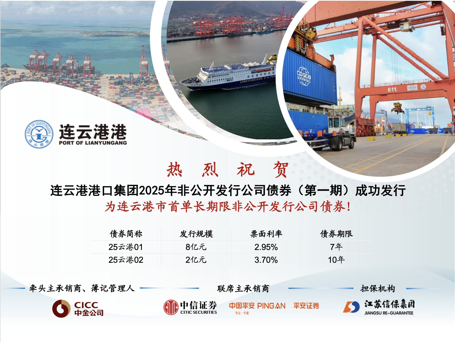近日,由集團增信的連云港港口集團10億元非公開發行公司債券在上交所成功發行。本期債券采取雙期限互撥機制,其中7年期品種發行8億元,票面利率2.95%,10年期品種發行2億元,票面利率3.70%。本期債券的成功發行,是連云港市屬國企首次成功發行超長期限非公開發行公司債券,創下連云港市屬國企有史以來超長期限債券發行價格新低。