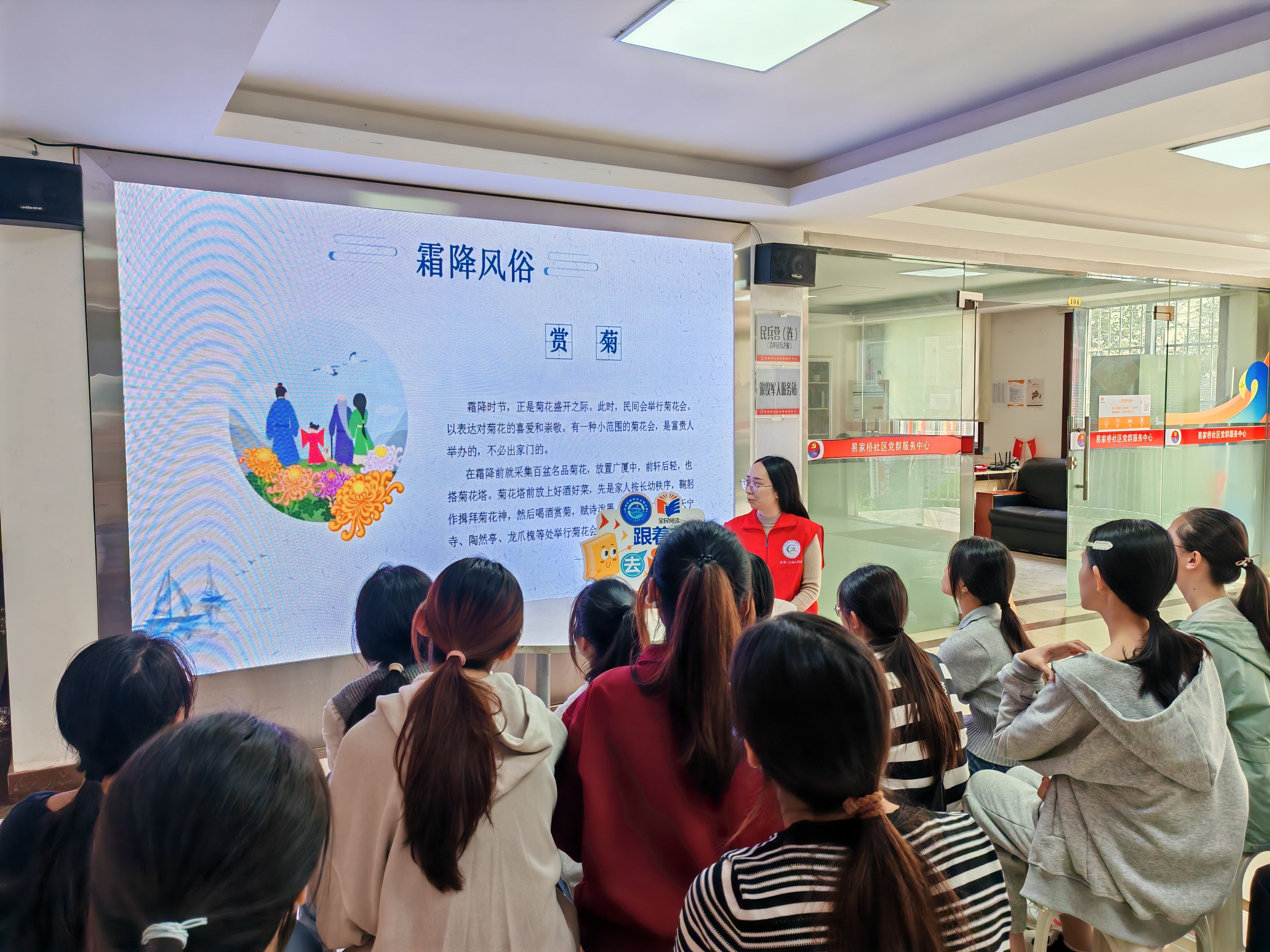 霜降,是二十四節氣中的第十八個節氣,秋季的最后一個節氣。活動中,志愿者們通過視頻觀看、課件講解,帶領大家探索節氣和大自然的秘密,感受時令變化,了解與“霜降”節氣有關的習俗、節氣養生、著名詩句,激發青少年對中國傳統節氣、習俗的興趣。最后,大家互相推薦好書、分享近期讀書感悟。