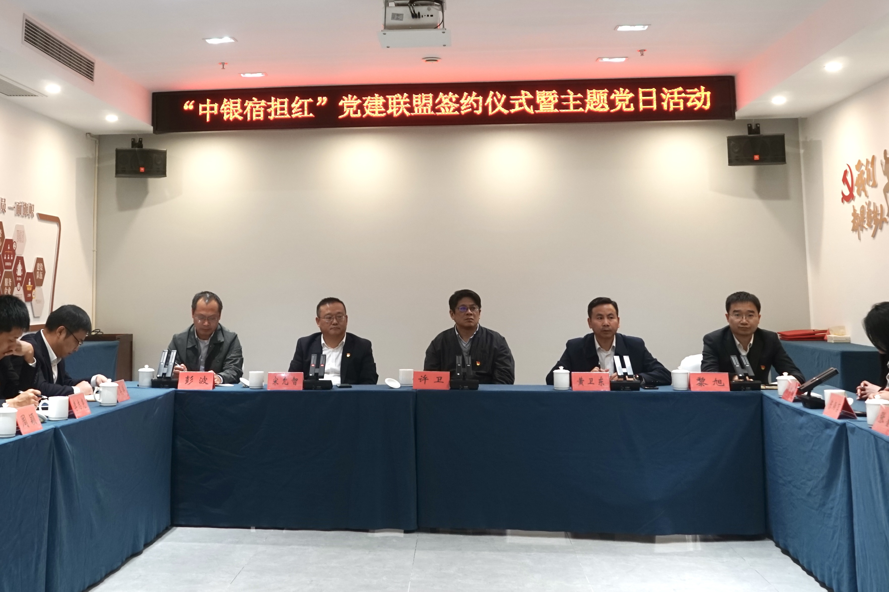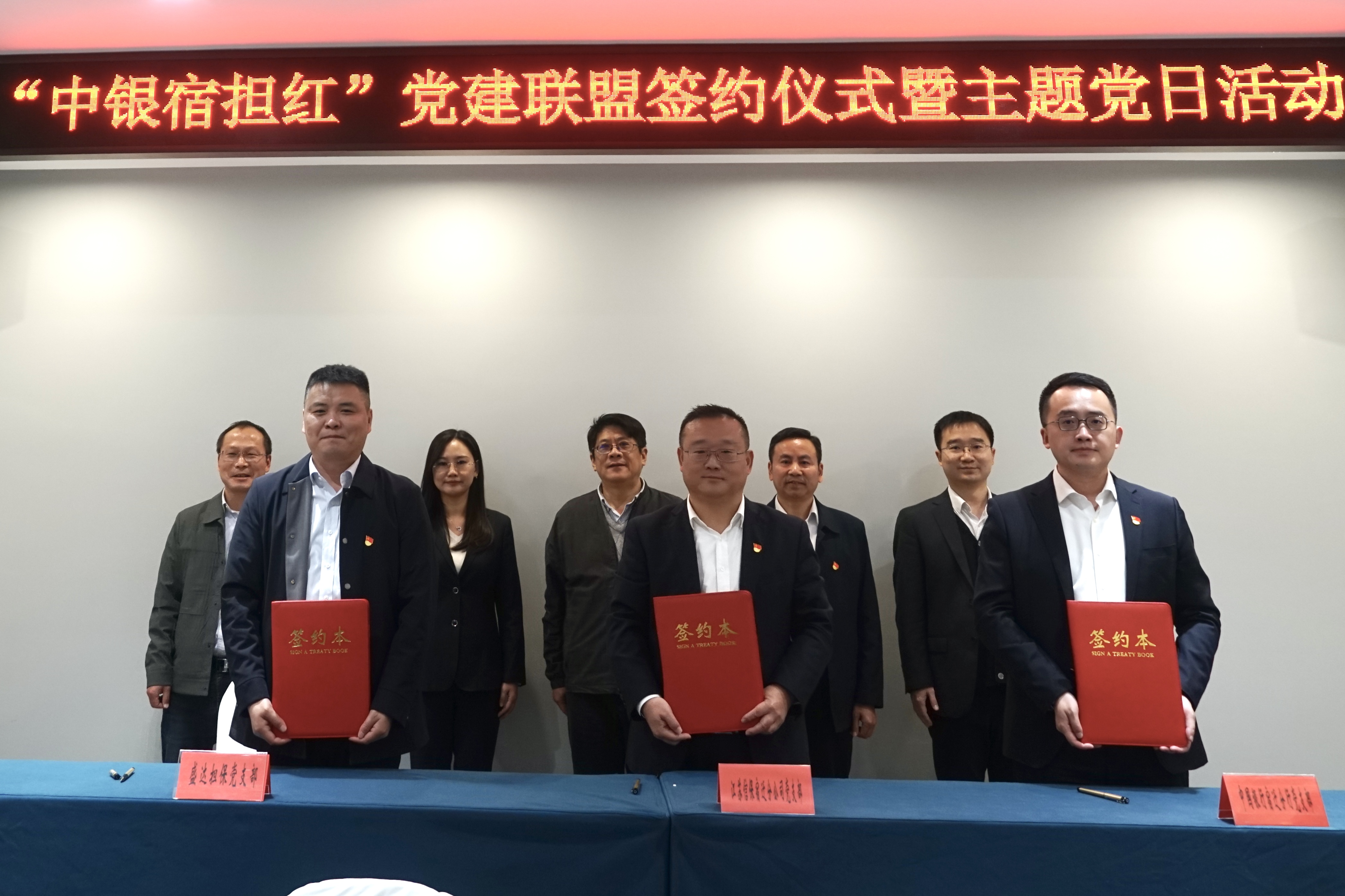為進一步深化銀擔合作,建立長期、穩定、快速的合作交流機制,促進黨建與業務深度融合,助推地區經濟蓬勃發展。10月21日下午,宿遷分公司黨支部、中國銀行宿遷分行普惠金融事業部黨支部、泗洪縣盛達融資擔保集團有限公司黨支部三方舉行“中銀宿擔紅”黨建聯盟簽約儀式。中共江蘇省委黨校投融資教研室主任許衛、宿遷市政府辦金融法規處處長黃衛東、泗洪縣黨史委副主任彭波參會指導。