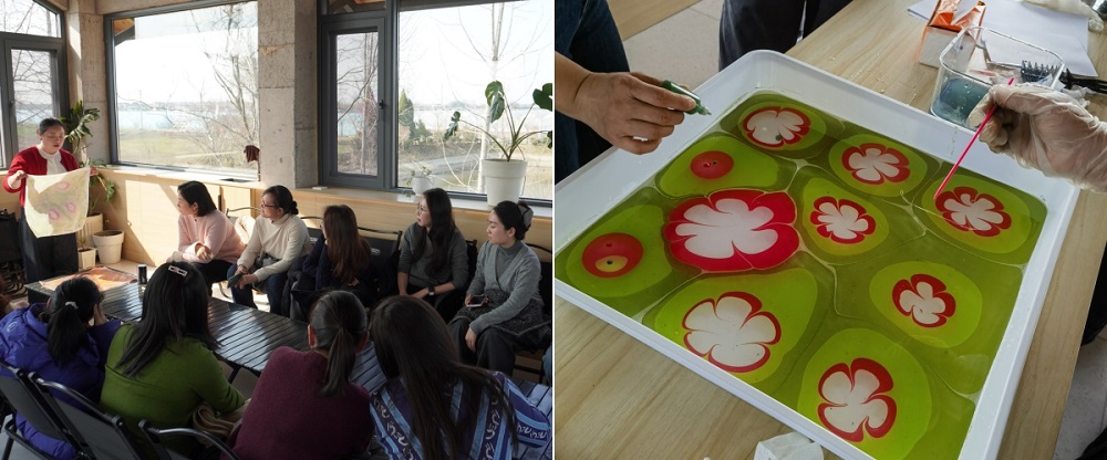 在非遺體驗活動現(xiàn)場,大家根據(jù)自己的喜好,將染料滴入水中,或輕輕撥動水面,或精準(zhǔn)滴落,層層疊疊的顏色在水面上緩緩鋪展,相互交織,相互融合,最終,這些圖案被巧妙地轉(zhuǎn)移到絲巾上,每條絲巾都成為了獨(dú)一無二的“手工限量版”。