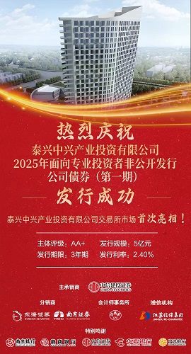 4月24日,泰興中興產業投資有限公司2025年面向專業投資者非公開發行公司債券(第一期)在上交所成功發行,發行規模5億元,期限3年,發行票面利率2.4%,本期債券由集團增信擔保,為企業在交易所實現首次亮相提供了有力支持。