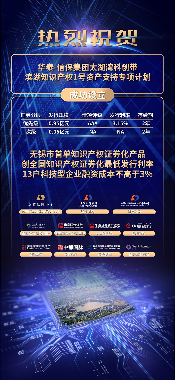 5月30日,由集團(tuán)增信、科貸公司作為原始權(quán)益人的集團(tuán)首單知識(shí)產(chǎn)權(quán)ABS項(xiàng)目——“華泰—信保集團(tuán)太湖灣科創(chuàng)帶濱湖知識(shí)產(chǎn)權(quán)1號(hào)資產(chǎn)支持專(zhuān)項(xiàng)計(jì)劃”在交易所成功發(fā)行。項(xiàng)目?jī)?chǔ)架規(guī)模5億元,首期1億元, 期限2年,發(fā)行利率3.15%,創(chuàng)全國(guó)知識(shí)產(chǎn)權(quán)證券化發(fā)行利率新低。