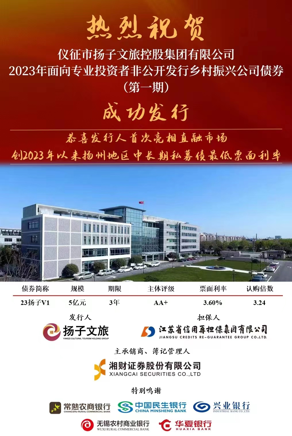 5月20日,揚州一體化區域推動的集團首單債券增信“總包”方案---儀征市揚子文旅控股集團有限公司2023年面向專業投資者非公開發行鄉村振興公司債券成功簿記發行,發行規模5億元,發行期限3年,全場認購倍數3.24,最終票面利率3.60%,創下今年以來揚州地區中長期限公司債最低票面利率。