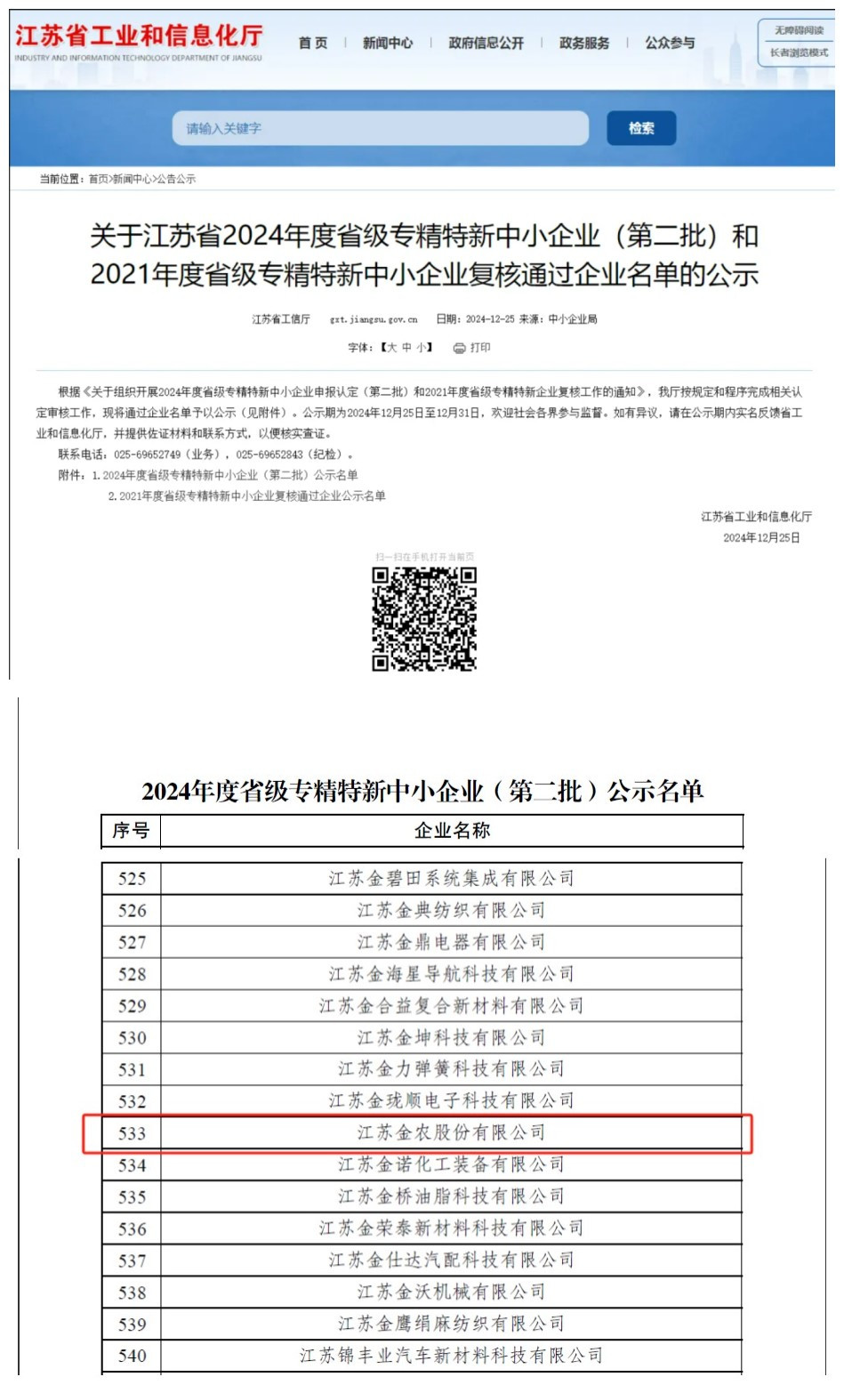 此前,江蘇省信息和工業化廳發布《關于江蘇省2024年度省級專精特新中小企業(第二批)和2021年度省級專精特新中小企業復核通過企業名單的公示》,金農公司成功入圍。