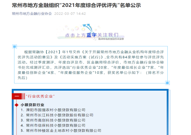 此次評選活動由常州市地方金融行業(yè)協(xié)會組織開展。綜合考慮參評單位經(jīng)營狀況、風(fēng)險(xiǎn)防控、創(chuàng)新發(fā)展、服務(wù)中小微等因素,經(jīng)季度測評、年度自評以及市、區(qū)金融局綜合評價(jià),評選出小額貸款、融資擔(dān)保、融資租賃、典當(dāng)?shù)鹊胤浇鹑凇靶袠I(yè)優(yōu)秀企業(yè)”20家,本次獲此獎項(xiàng)的小貸公司僅5家。