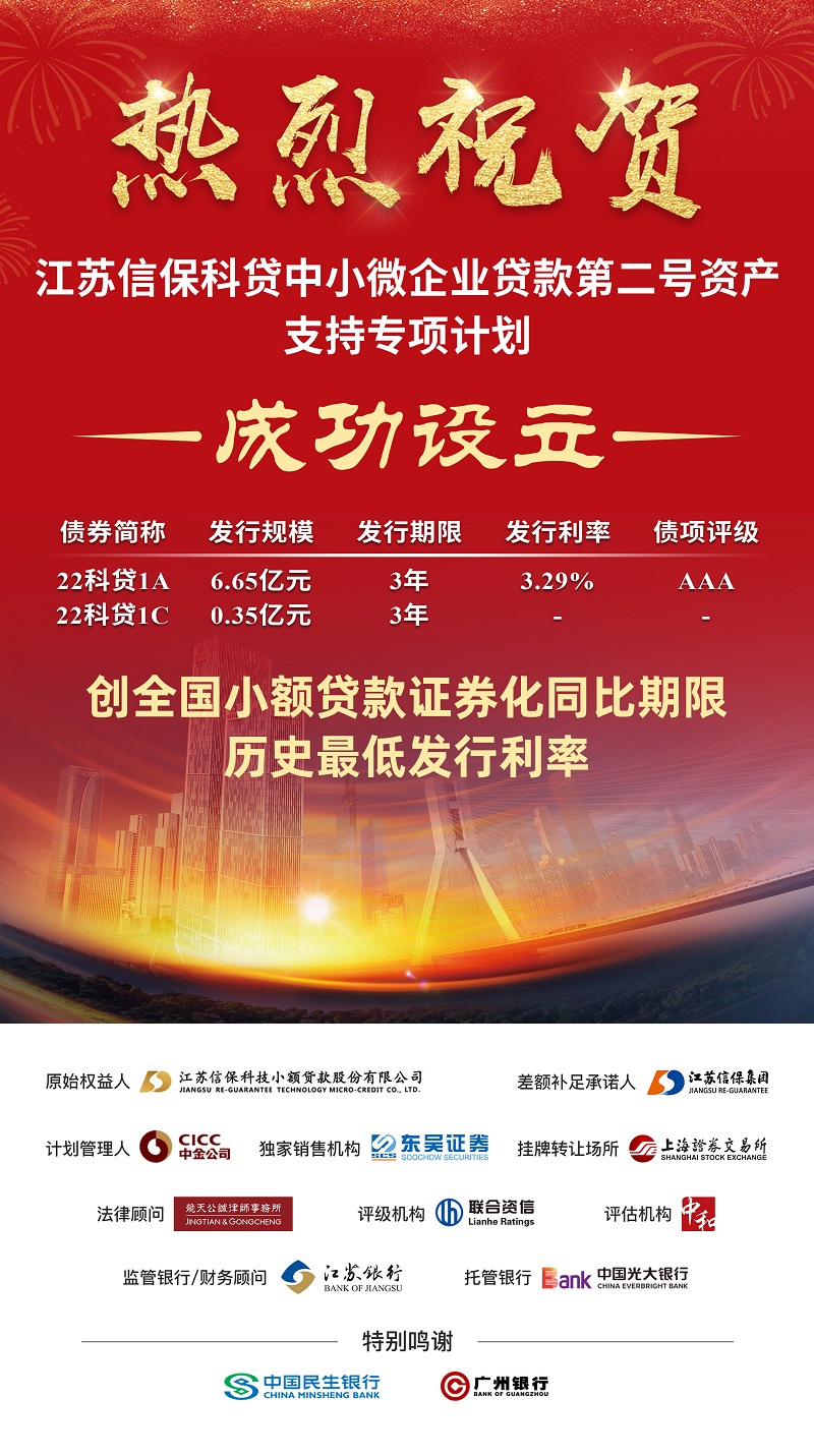 6月28日,江蘇信保科貸中小微企業貸款第2期資產支持專項計劃成功發行,該項目總規模20億元,本次發債規模7億元,期限3年,票面利率3.29%,創全國3年期小額貸款ABS利率最低水平。