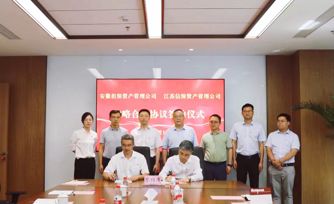 在江蘇信保集團副總裁姜斌,安徽省信用融資擔保集團有限公司合規總監朱曉平見證下,雙方共同簽署了戰略合作協議,就進一步深化雙方在黨建共建、人才培養、業務發展等方面達成務實合作。下一步將雙方將加強溝通協商,開展業務協同,對接資產收購、運營和處置等合作。