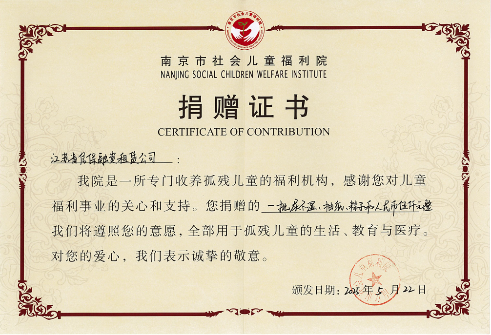 在端午節和“六一”兒童節雙節來臨之際,信保租賃走進南京市社會兒童福利院開展愛心捐贈活動。公司員工及子女積極響應此次公益活動,以實際行動踐行社會主義核心價值觀。共有45名員工參與捐贈,共籌得善款7250元,其中5000元用于公益捐贈,剩余款項為福利院購置一批尿不濕、紙巾、粽子等生活物資,為孩子們的成長注入一份溫暖與關懷。